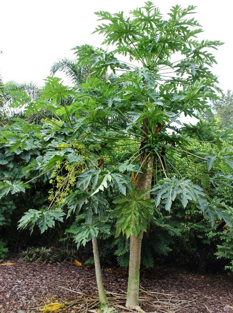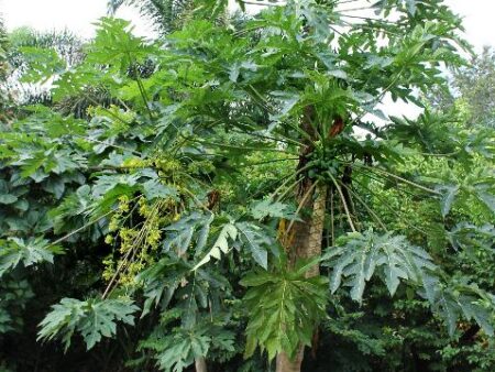 The papaya plant has an erect branchless trunk 6-20 ft tall, and a palm-like head of foliage at the top. Some papaya bear only short-stalked female flowers or bisexual flowers, while others may bear only male flowers. The flowers of papaya are usually white and small. The smooth-skinned fruits are green, yellow and typically weigh about 0.5 kg. They hang on short stalks in clusters directly from the trunk beneath the umbrella of giant leaves.