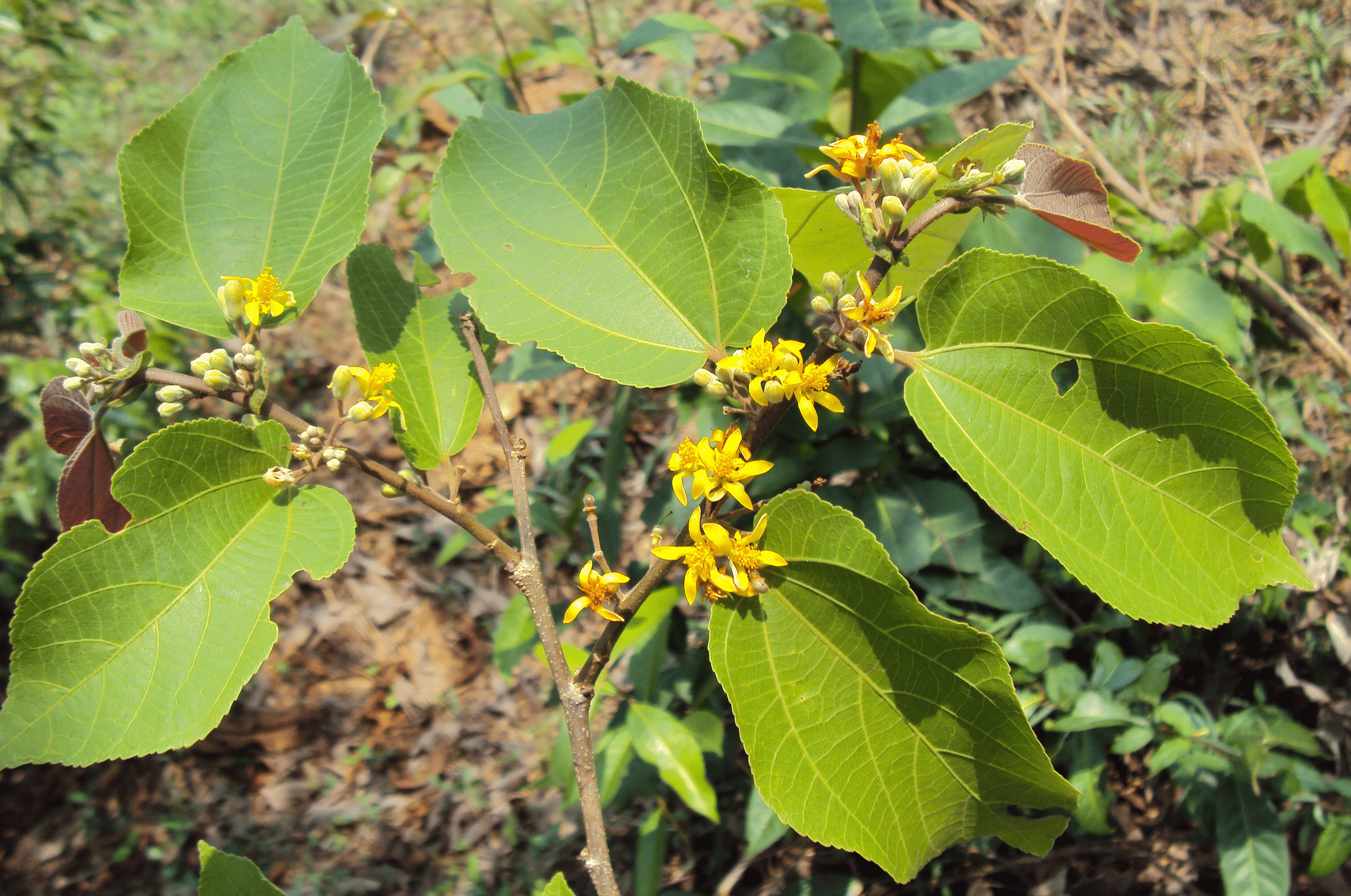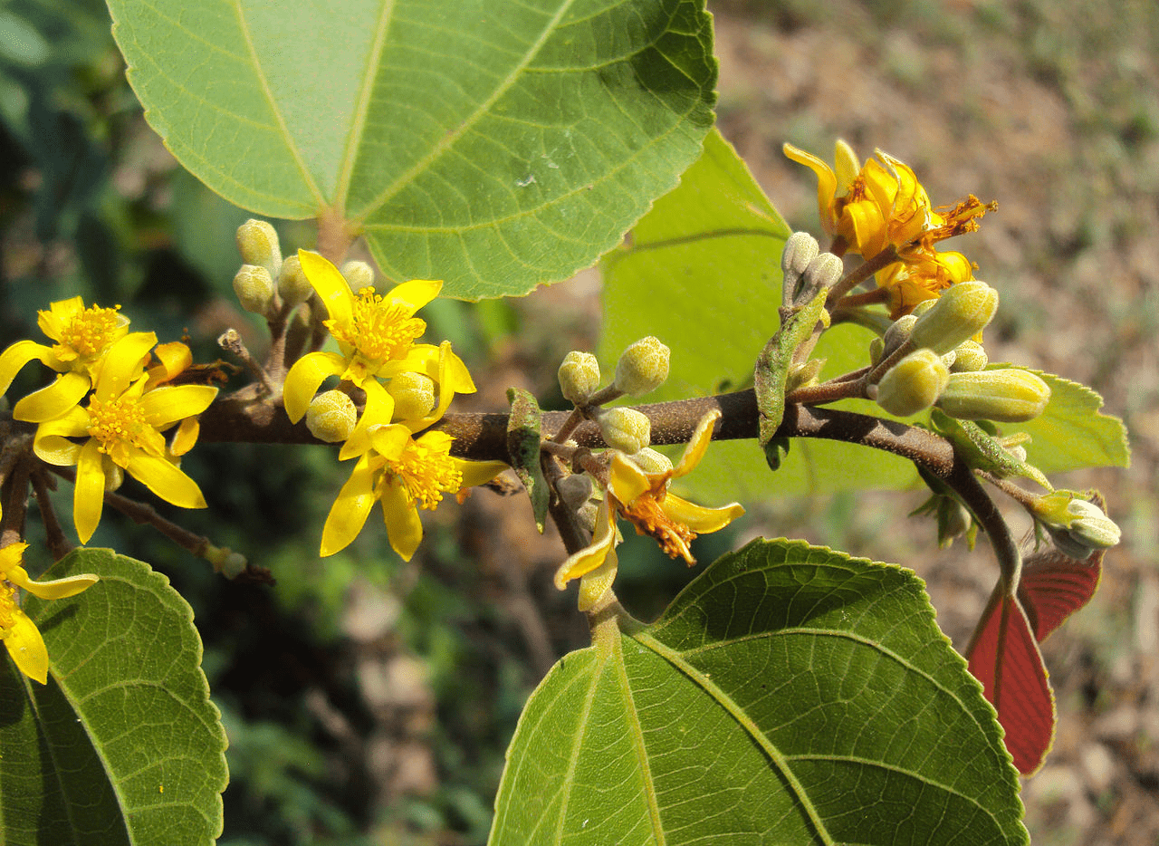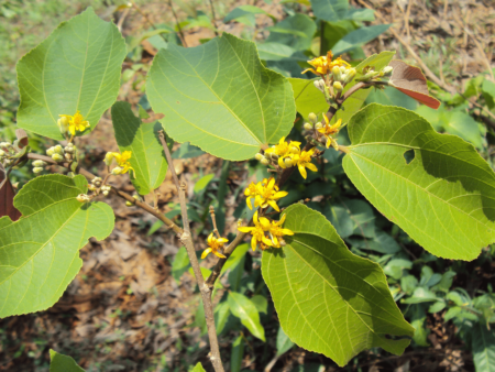 Brief Details: Dhaman is a moderate-sized to large tree, attaining a bole length of about 30 ft. and a girth of 7 ft. or more. It is Bark grey or dark brown. The yellow flower resembles the true Phalsa flower very much. The main difference is in the leaves. The leaves of Dhaman are oblique heart-shaped, a characteristic shared by the Linden trees, which belong to the genus Tilia. The botanical name tiliifolia means, leaves resembling Tilia. Flowering: April.